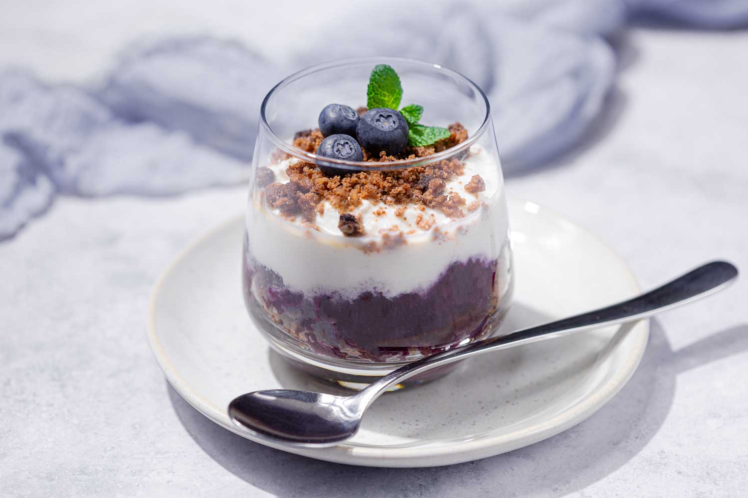 Das Heidelbeer-Dessert ist ein typisches Trifle, also ein Schichtdessert aus Kuchenstücken, Creme und Frucht. Man kann es gut portionieren und es sieht auch immer dekorativ aus, auch wenn man keine Erfahrung hat.